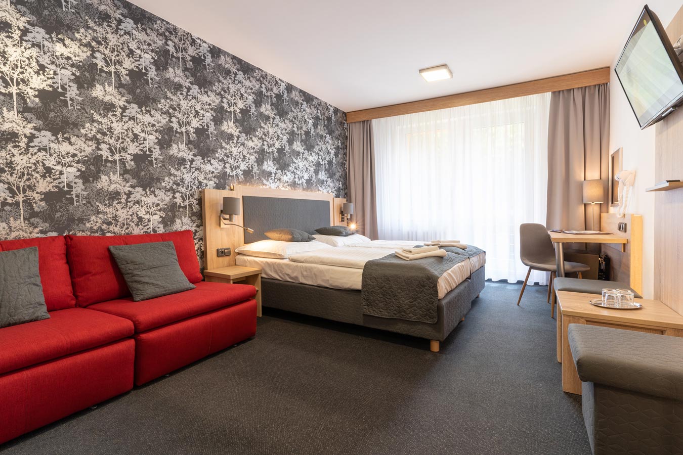 Máme pro Vás také pokoje Comfort s příjemným posezením, které je možné využít jako dvě rozkládací přistýlky. Cenu ubytování v pokoji Comfort Vám zobrazí náš online rezervační systém.